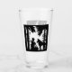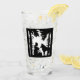 This glass tumbler for beverages has Little Red Riding hood in black silhouette sitting in the forest under trees holding flowers talking to the wolf on the front and back.