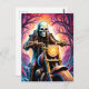 a skeleton gripped in pandemonium bike. Riding through the intertwining branches on the trail .He had a hopped-up .He has a black leather trousers and motorcycle boots And a black leather jacket with bone like design on the bilker outfit .With the sun going down behind him. Haze rising up from around him into the dark night he rids away with night stars above.