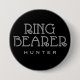 Identify the members of your wedding party with these personalised faux-glitter on black name tag buttons. ‘Ring Bearer’ is spelled out in silver glitter-look typography. Below, customise it with a name (or text of your choice), using the easy to use provided template. Please check my store for button designs available for all members of your wedding party!