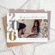 Affordable custom printed holiday cards with a simple template for customisation. Announce your holiday season engagement with this modern minimalist New Year photo card. The design features large typography with the new year date and "Ringing in the New Year" headline in muted mauve, grey and gold colours. Personalise it with your photo and custom text. Use the design tools to choose any fonts and colour, add more photos and create a unique one of a kind New Year photo magnet.