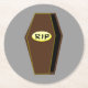 This awesome paper coaster features a creepy coffin made from wood with gold edging. The coffin lid is slightly open revealing only darkness within. The gold plaque on the front of the coffin has spooky black text on it that says RIP, giving no clue who or what might be lurking inside. This fun yet sinister coffin is ideal for Halloween. The bleak grey background acts to draw the eye of the observer towards the coffin of doom.