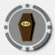 This awesome set of poker chips features a creepy coffin made from wood with gold edging. The coffin lid is slightly open revealing only darkness within. The gold plaque on the front of the coffin has spooky black text on it that says RIP, giving no clue who or what might be lurking inside. This fun yet sinister coffin is ideal for Halloween. The bleak grey background acts to draw the eye of the observer towards the coffin of doom.