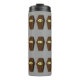 This awesome thermal tumbler features a creepy coffin made from wood with gold edging. The coffin lid is slightly open revealing only darkness within. The gold plaque on the front of the coffin has spooky black text on it that says RIP, giving no clue who or what might be lurking inside. This fun yet sinister coffin is ideal for Halloween. The bleak grey background acts to draw the eye of the observer towards the coffin of doom.