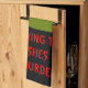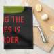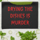 This awesome kitchen towel features a grey tombstone with RIP in dripping black text on it, standing on a patch of green grass. Befitting of this morbid design the background is black. There is funny red customisable text that reads "Drying the dishes is murder"