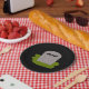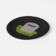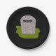 This awesome paper party plate features a grey tombstone with RIP in dripping black text on it, standing on a patch of green grass. Befitting of this morbid design the background is black.