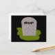 This spooky postcard features a grey tombstone with RIP in dripping text on it, standing on a patch of green grass. Befitting of this morbid design the background is black.
