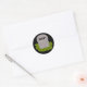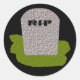 This fiendish set of round stickers features a grey tombstone with RIP in dripping text on it, standing on a patch of green grass. Befitting of this morbid design the background is black.