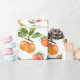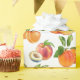 Watercolor realistic ripe peaches, apricots and plums pattern with a name badge.