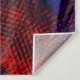 Riscos vermelhos com tons mais claros e escuros que foram cruzados e passados em um filtro que os modificou de maneira que não se percebe mais serem riscos, mas, parecem formas quase quadradas sobre um fundo azul, podendo causar a percepção de profundidade no azul.