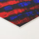 Riscos vermelhos com tons mais claros e escuros que foram cruzados e passados em um filtro que os modificou de maneira que não se percebe mais serem riscos, mas, parecem formas quase quadradas sobre um fundo azul, podendo causar a percepção de profundidade no azul.