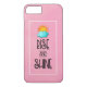 Phone case with a cute typographical design. A fluffy cloud and an orange sun set on a pink background.