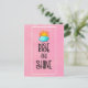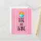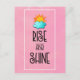 A postcard with a cute typographical design. A fluffy cloud and an orange sun set on a lavender background. Rise and Shine written in a cool trendy font.