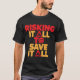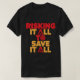 This black t-shirt features the text "RISKING IT ALL" at the top in a bold red font. Below, "TO" is stacked above a heart shape, both in red. The phrase "SAVE IT ALL" is at the bottom in a bold yellow font. Stylised flame graphics are incorporated into the words "IT" in both the top and bottom phrases. This design honours the bravery and dedication of firefighters.