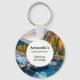 A keychain with a scenic photograph featuring tree covered mountains in autumn colours. A vibrant river flows around a multitude of rocks.
