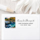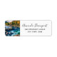 Address labels with a scenic photograph featuring tree covered mountains in autumn colours. A vibrant river flows around some rocks.