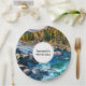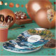 Paper plates with a scenic photograph featuring tree covered mountains in autumn colours. A vibrant river flows around a multitude of rocks.