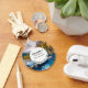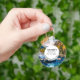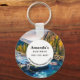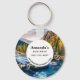 A keychain with a scenic photograph featuring tree covered mountains in autumn colours. A river flowing around rocks.