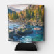 Can cooler with a scenic photograph featuring tree covered mountains in autumn colours. A vibrant river flows around a multitude of rocks.