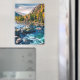 Magnet with a scenic photograph featuring tree covered mountains in autumn colours. A vibrant river flows around some rocks.