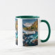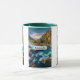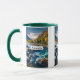 A mug with a scenic photograph featuring tree covered mountains in autumn colours. A vibrant river flows around a multitude of rocks. A large white full moon hovers above.