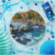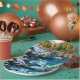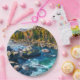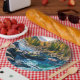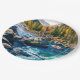 Paper plates with a scenic photograph featuring tree covered mountains in autumn colours. A vibrant river flows around a multitude of rocks.