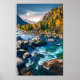 Poster with a scenic photograph featuring tree covered mountains in autumn colours. A river flowing around rocks. A large white full moon hovers above.