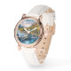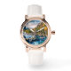 A watch with a scenic photograph featuring tree covered mountains in autumn colours. A river flowing around rocks. A large white full moon hovers above.