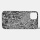 River water rushes over indiscernible rocks creating chaotic ripples and patterns of reflected light in this black and white photograph. The oblong and curving white lines flow around dark obscured rocks beneath the surface to create an abstract photo reminiscent of marble. The stylish photo was taken at a river in the vicinity of Seattle, Washington.