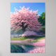 A languid river meanders by a breathtaking cherry blossom tree, adorned in delicate pink petals, with its verdant banks adorned in a carpet of lush green grass. The gentle flow of water serenades as it passes by, a perfect setting for meditation or contemplation.