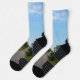 The socks have a picture of a long straight road with small hills with a blue sky.