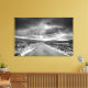 This photo features a black and white of a road leading into a rainstorm.