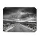 This photo features a black and white of a road leading into a rainstorm.