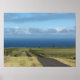 A hilly dirt road leading towards the beautiful blue Hawaiian coast, grass on either side and puffs of clouds in the azure sky. Taken on the Big Island of Hawaii.