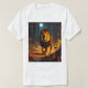 A powerful lion stands proudly, wearing a stylish T-shirt that contrasts with its majestic mane. The T-shirt is snugly fit, featuring a bold design that complements the lion's regal aura. The lion's golden fur and thick mane frame the shirt, highlighting its fierce yet laid-back demeanour. Its eyes are sharp and focused, exuding confidence, while the casual attire adds a playful twist to its formidable presence. The scene captures the essence of strength combined with a touch of modern, cool fashion.
