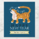 This retro and cute chinese new year holiday wine label features a roaring tiger on a navy blue background. Personalise it for your needs. You can find matching products at my store.