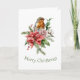 A Robin amongst a poinsettia and a rose and greenery Christmas greeting card.