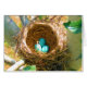 Picture of three turquoise blue robin eggs together not hatched yet in a brown, wood twig nest in a tree. Light colour tree bark in background with a few green leaves. I climbed a tree in my back yard for this photo, then photographed the birds a week later as they hatched, then fledged a week after that. I pruned some of the branches so that I had a clear shot at the nest. Digital photo.