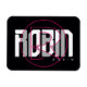 This graphic offers a contemporary reinterpretation of the Robin emblem, blending classic elements with modern design sensibilities. The logo centres around a bold, geometric depiction of the word "ROBIN," set in stark white against a deep black background, encapsulated within a striking pink circle that adds a dynamic visual contrast. The circle not only frames the text but also breaks through it, suggesting Robin's emergence from the shadow of Batman to establish his own identity. The use of pink adds an unexpected twist, lending a fresh and modern vibe while still paying homage to the traditional red associated with Robin. This design captures the essence of Robin's evolution as a character, blending his heroic legacy with a sleek, urban aesthetic suitable for a new generation of fans.