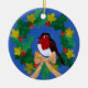 A Christmas ornament with a robin redbreast perching on a holly and ivy wreath with a golden bow, from a handpainted paper collage by Judy Adamson. Greeting Card with this design also available.