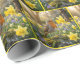 In a sunlit garden, a robin sings atop a moss-covered rock into a yellow daffodil, surrounded by blooming bluebells and daffodils in springtime