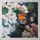 Oil painting in a realistic style, representing a single red robin bird sitting on blooming cherry blossom tree branches.
