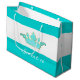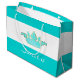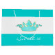 Large chic gift bag done in a robin's egg blue and white horizontal stripe pattern. Graphics of a blue and gold tone crown, decorates the middle of the bag. Personalise the white text, on the bottom of the bag to suit your occasion. Great for birthdays, Sweet 16, congratulations and Quinceañera.