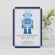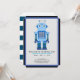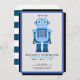 Celebrate your little one's first birthday with our modern blue robot Birthday Party invitation. Designs features a blue robot toy on grey, black and white background, background colour is editable. Cards reverse to editable blue stripes pattern.