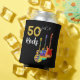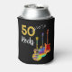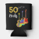 50 Rocks 50th birthday party can coolers with three cool watercolor guitar designs on black background. An electric guitar with Fire flame pattern and red pick guard, a multicolored semi acoustic guitar and a psychedelic classic acoustic guitar art illustration with personalised black and gold modern cool typography. Celebrate fifty in rock n roll style ideal for a guitarist, musician and music lovers. This cool modern musical instrument design is the perfect way to rock a fiftieth birthday. Original artwork by artist Catherine Sweetman