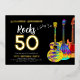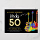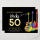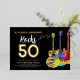 Celebrate your 50th birthday in rock and roll style with this colourful, psychedelic guitar music personalised black and gold invitation. Add the birthday celebrant’s name to declare that they really do Rock 50. A fun music themed design with modern gold typography and musical notes for the rockstar who wants to celebrate 50 in rock n roll style. Unique original musical instrument artwork by artist Catherine Sweetman.