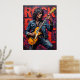 This painting depicts a male rock musician playing an electric guitar with intense focus. The musician, with long, dark hair and dressed in a denim jacket and jeans, is captured in a moment of performance. The background is a textured, abstract mix of red, purple, and black, with the word "ROCK" boldly visible. The artwork uses a heavy impasto technique, with thick, expressive brushstrokes that convey the raw energy and passion of rock and roll music.