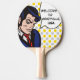 Welcome to Crazyville, USA! Is this your first time visiting? Enjoy your stay! This designer ping pong paddle features a comic book style drawing of a brooding man with a pompadour and a red tie with a speech bubble that says, "Welcome to Crazyville, USA." The man and speech bubble are on a yellow and grey polka dot background. Even with his solemn disposition, he'll brighten the day of any ping pong player, 50's music lover, pop art fan, or comic book collector.