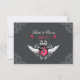 Unconventional RSVP card to be sent with the matching wedding invitation, on fuchsia pink, white and grey featuring a rock and roll theme with illustration of electric guitars, wings and elegant baroque vintage ornaments.