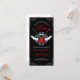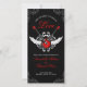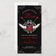 Unconventional wedding program on red, white and black featuring a rock and roll theme with illustration of electric guitars, wings and elegant baroque vintage ornaments.