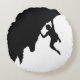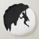 This round throw pillow features a black silhouette of a man rock climbing on a white background by well known British artist J.M.Tellam BA (hons), in a choice of cotton or polyester. Art copyright Mindgoop